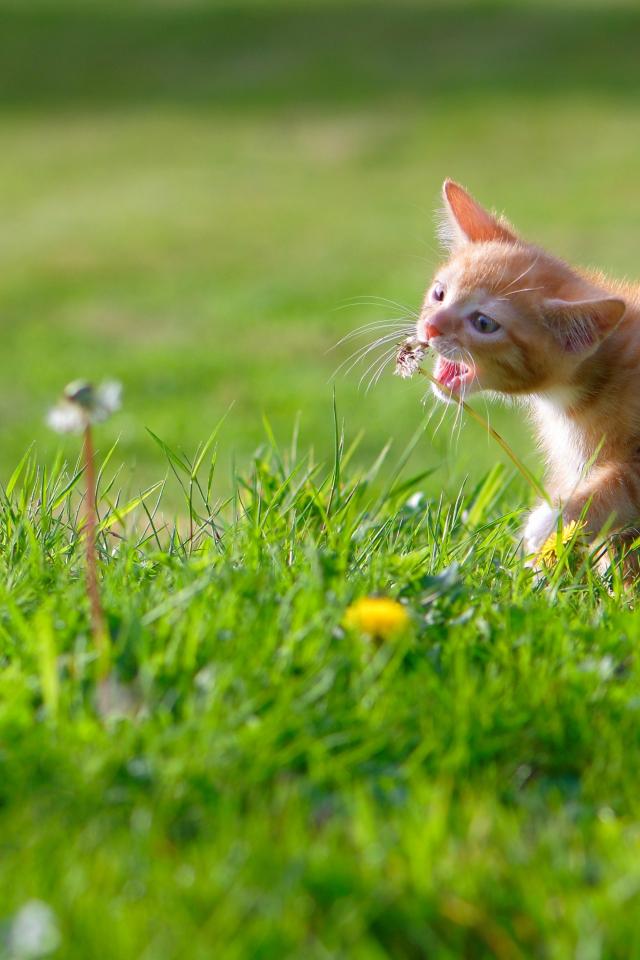 Обои Маленький рыжий котенок играет с цветком одуванчика