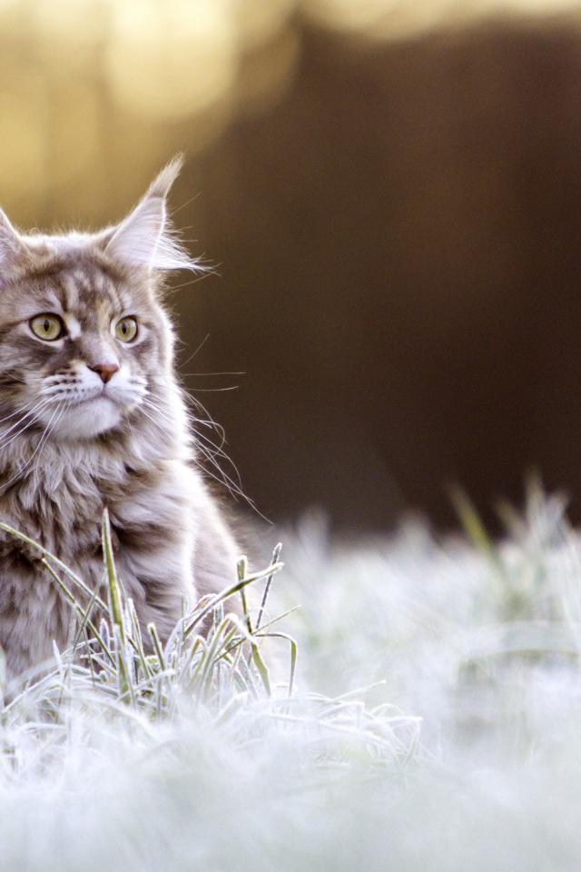 Обои Рыжий кот породы Мейн-кун сидит в покрытой инеем траве