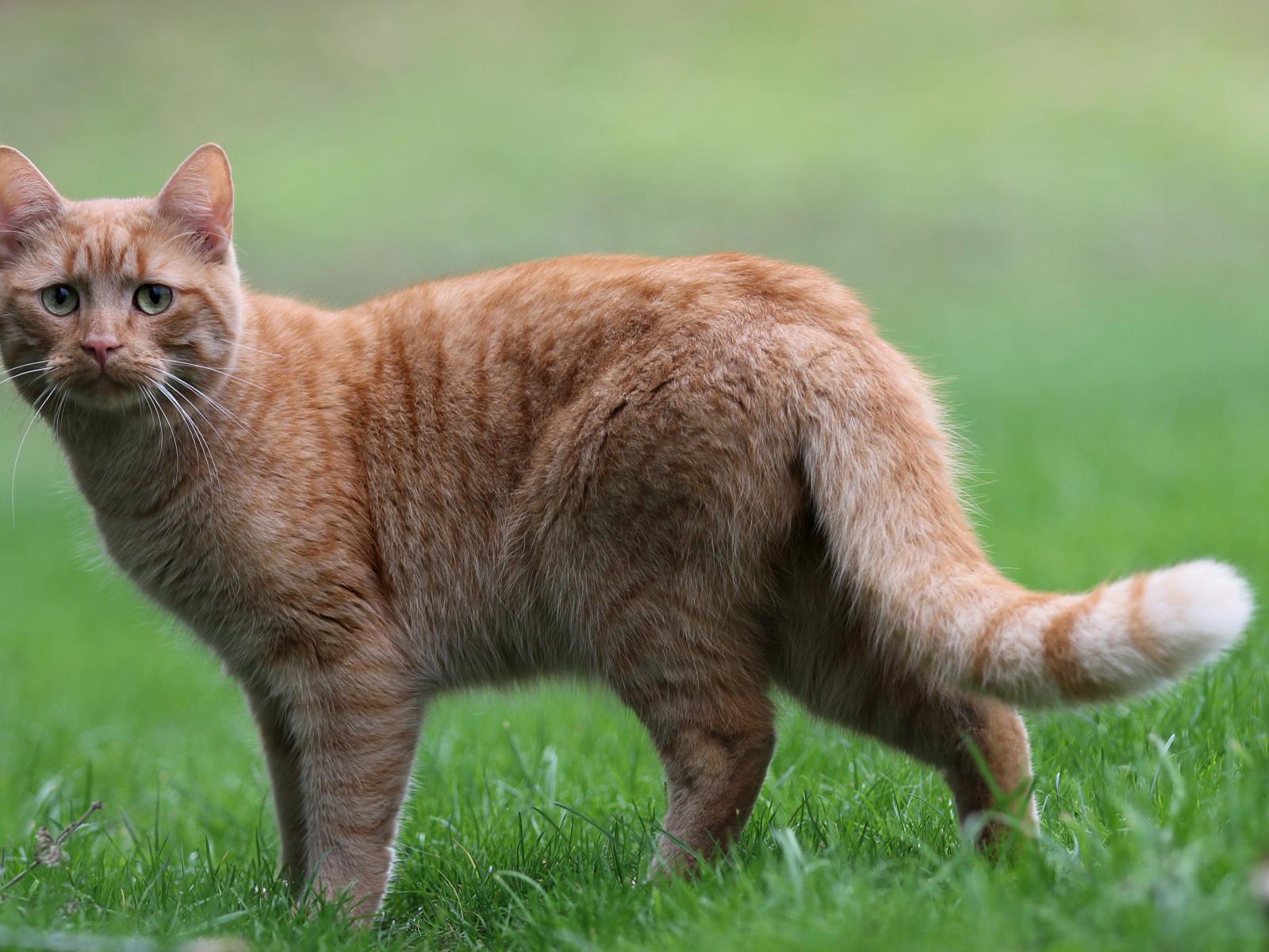 Обои Грустный рыжий кот стоит на зеленой траве