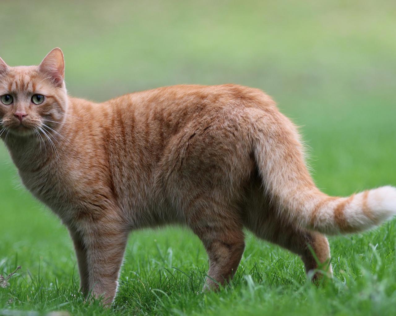 Обои Грустный рыжий кот стоит на зеленой траве