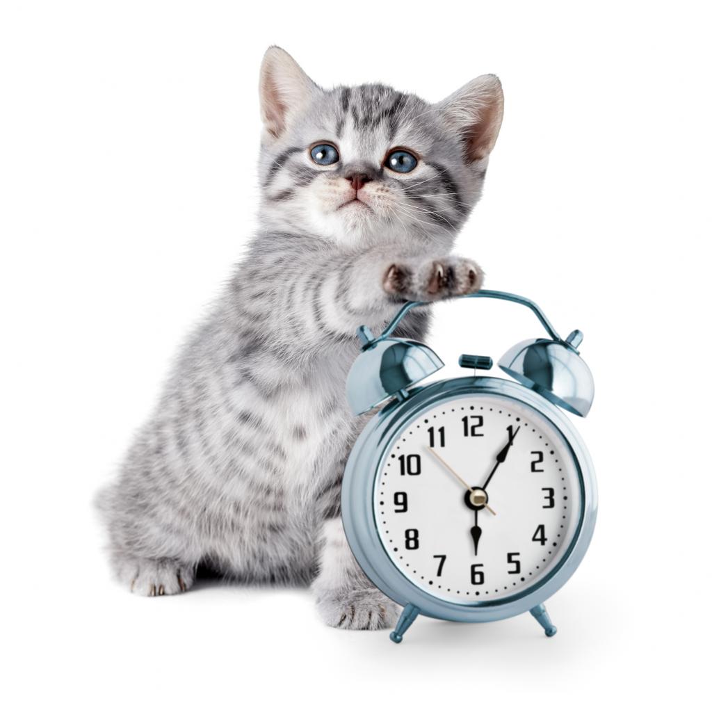 » Обои Маленький серый котенок будильником на белом фоне