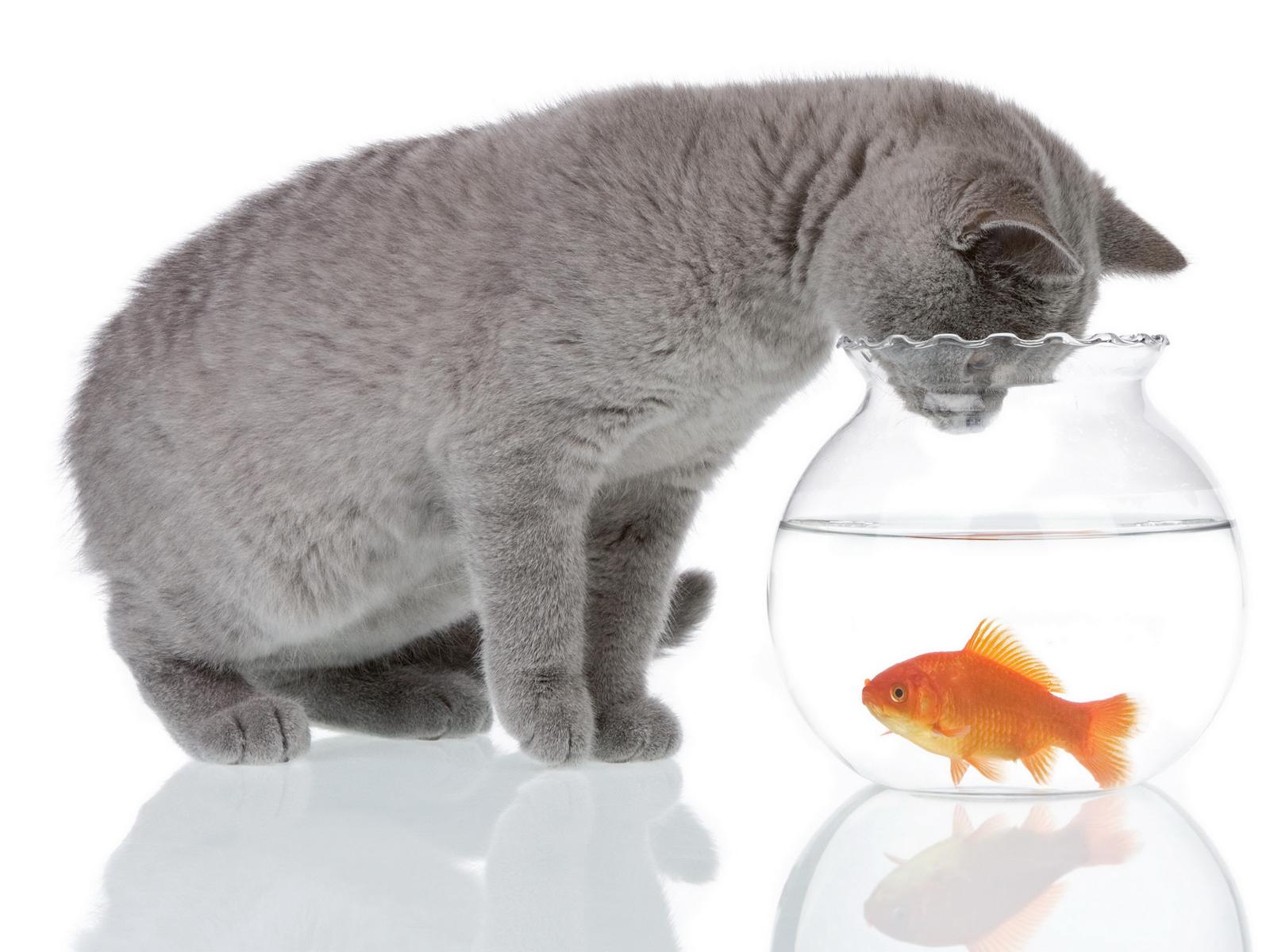 Обои Серый кот заглядывает в аквариум с золотой рыбкой на белом фоне