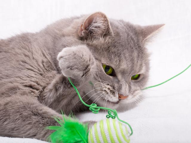 Обои Серый зеленоглазый кот играет с игрушкой на белом фоне