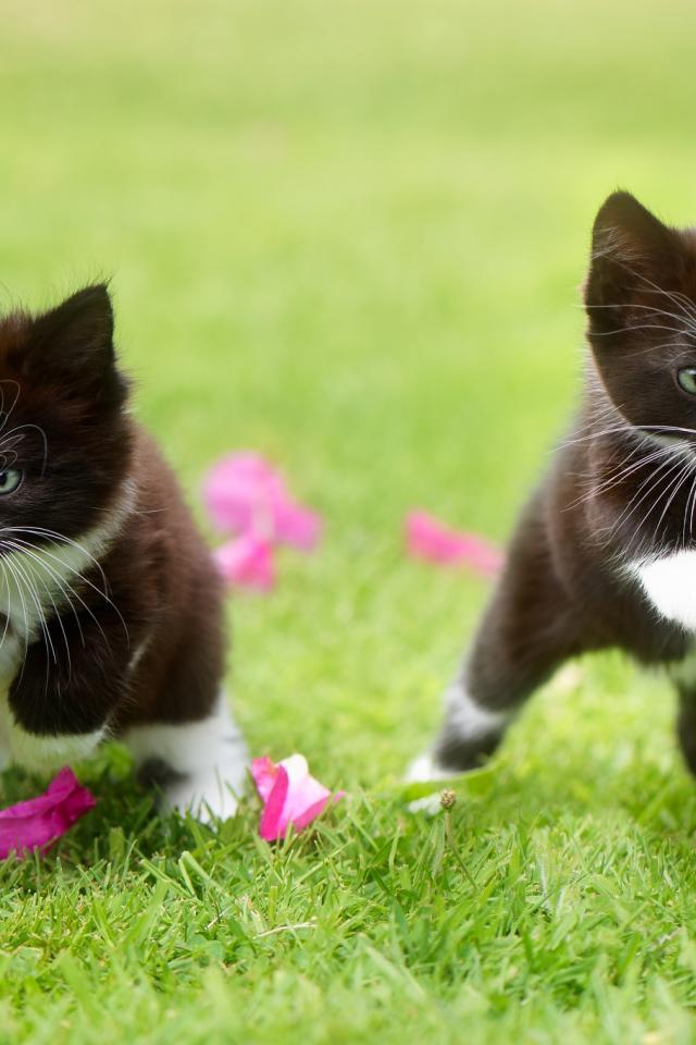 Обои Два черно-белых котенка прыгают по зеленой траве