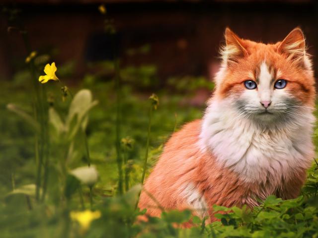 Обои Голубоглазый рыжий кот сидит в зеленой траве