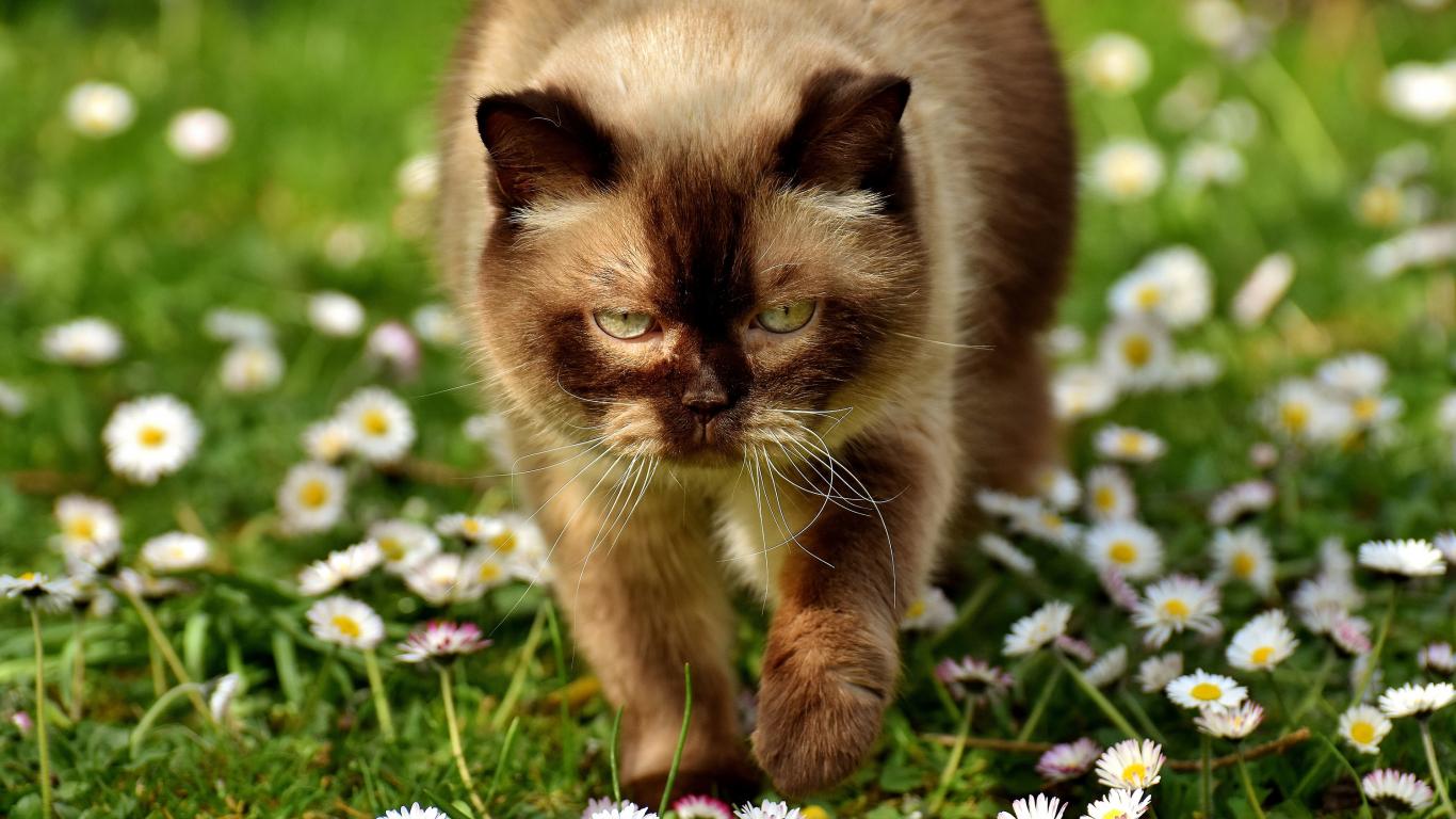 Обои Большой сиамский кот идет по белым цветам маргариткам
