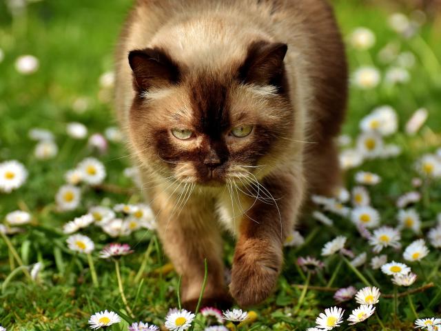 Обои Большой сиамский кот идет по белым цветам маргариткам