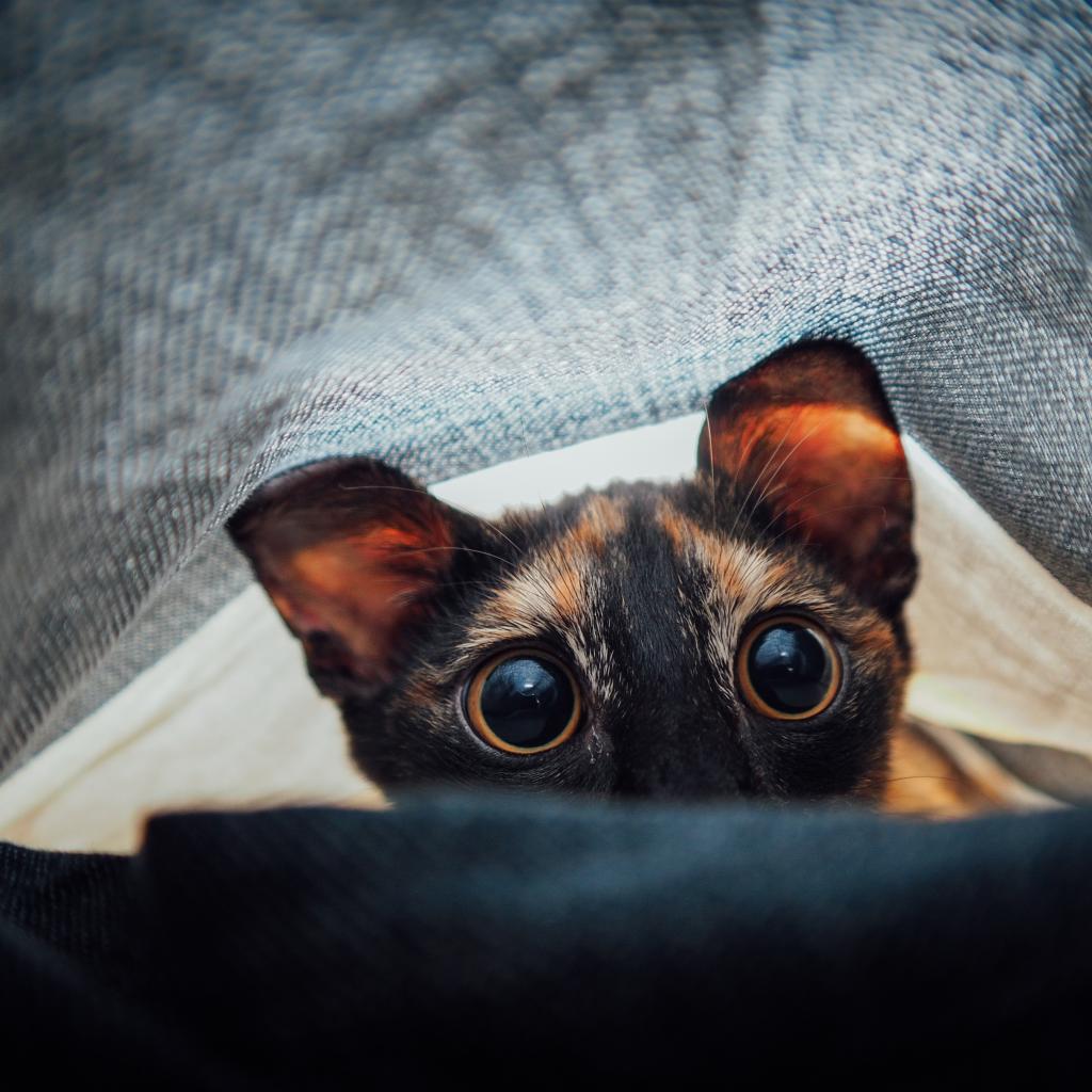 Обои Любопытный кот с большими глазами под одеялом