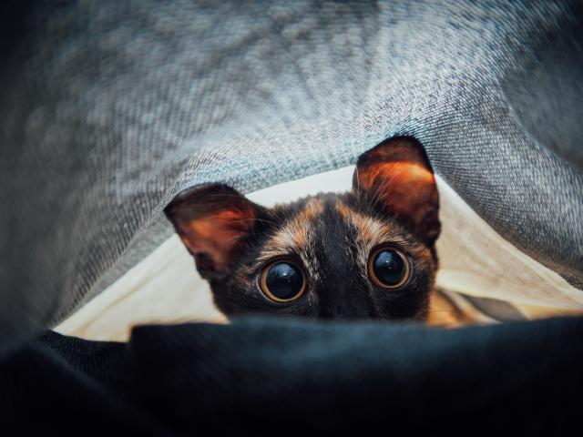 Обои Любопытный кот с большими глазами под одеялом