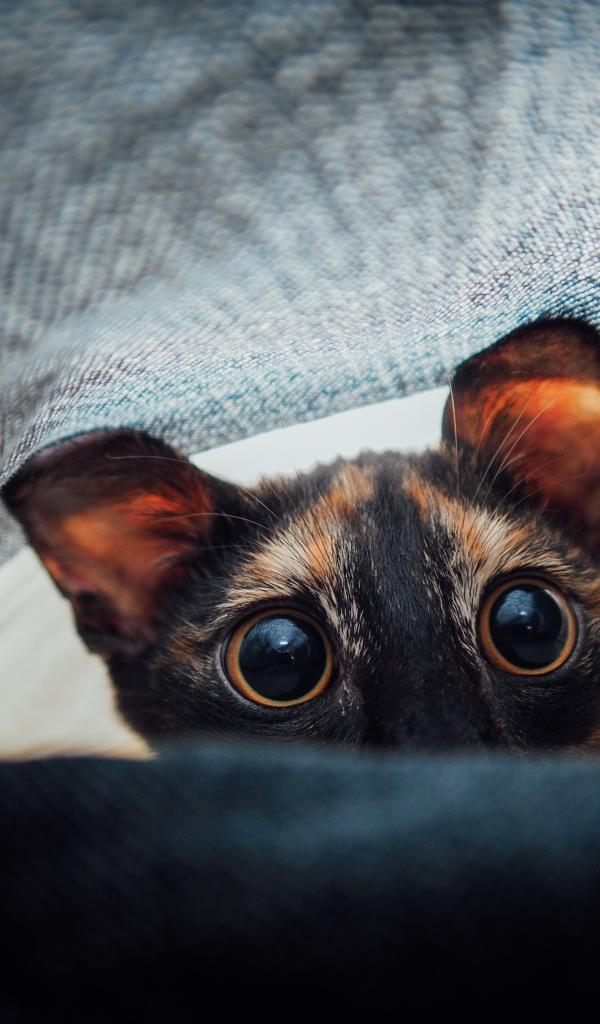 Обои Любопытный кот с большими глазами под одеялом
