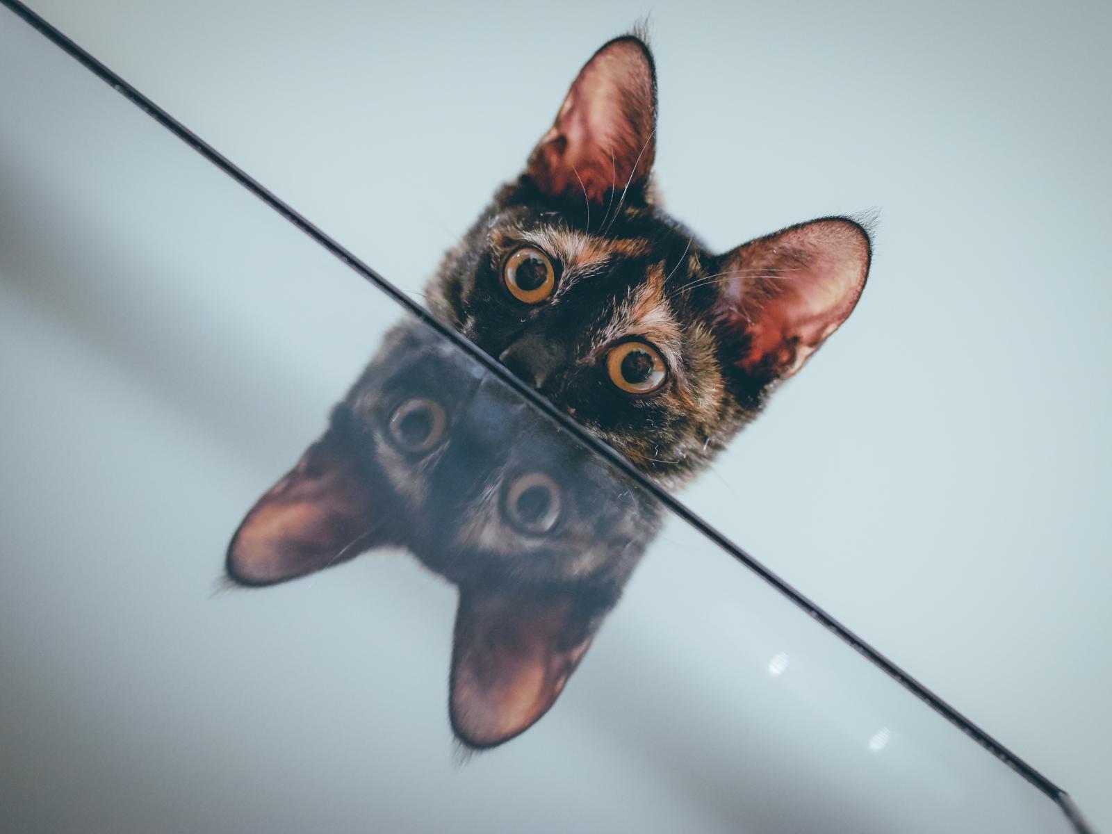 Обои Любопытный кот отражается в поверхности стола