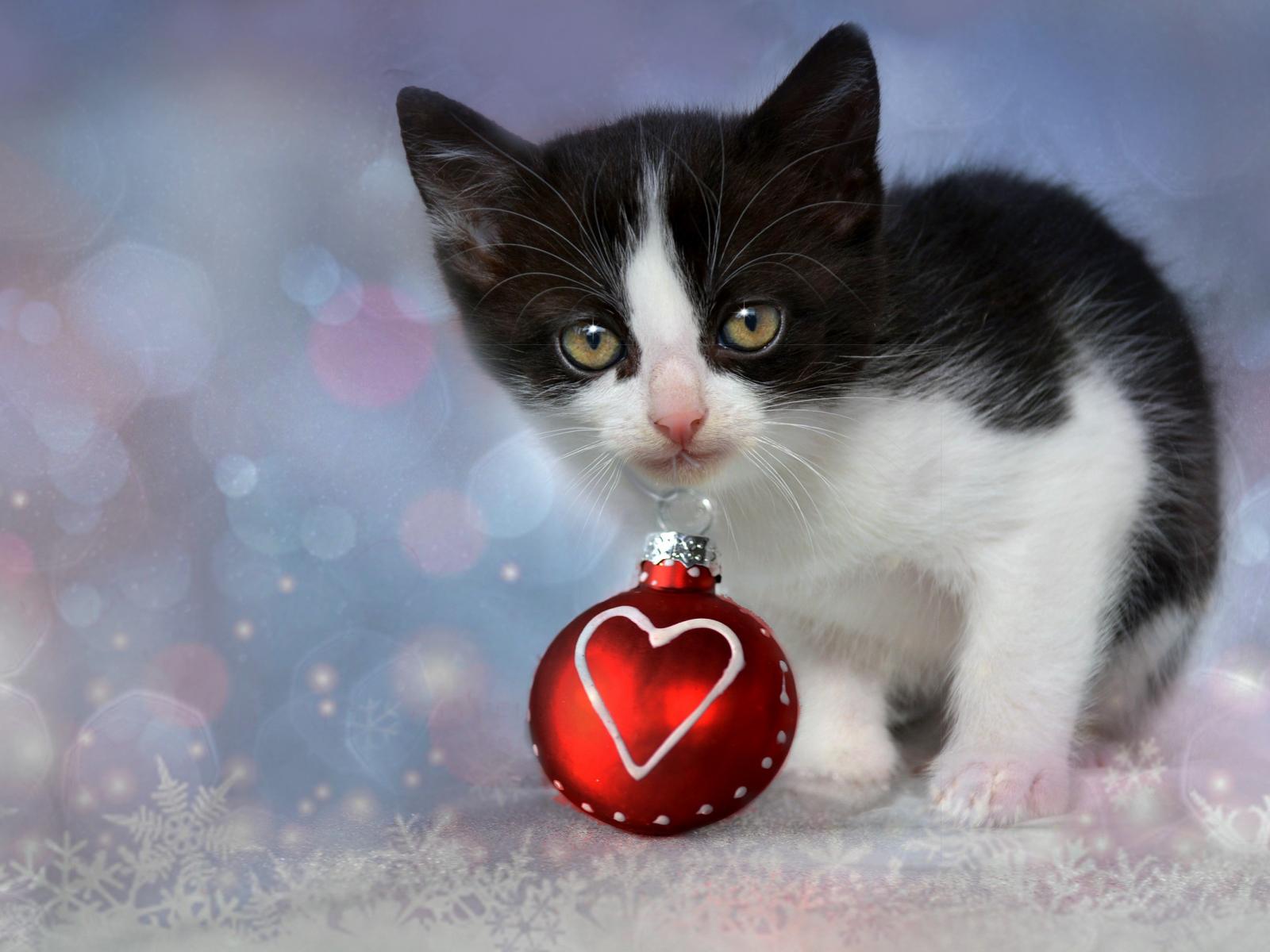 Обои Маленький котенок с красным елочным шариком в зубах