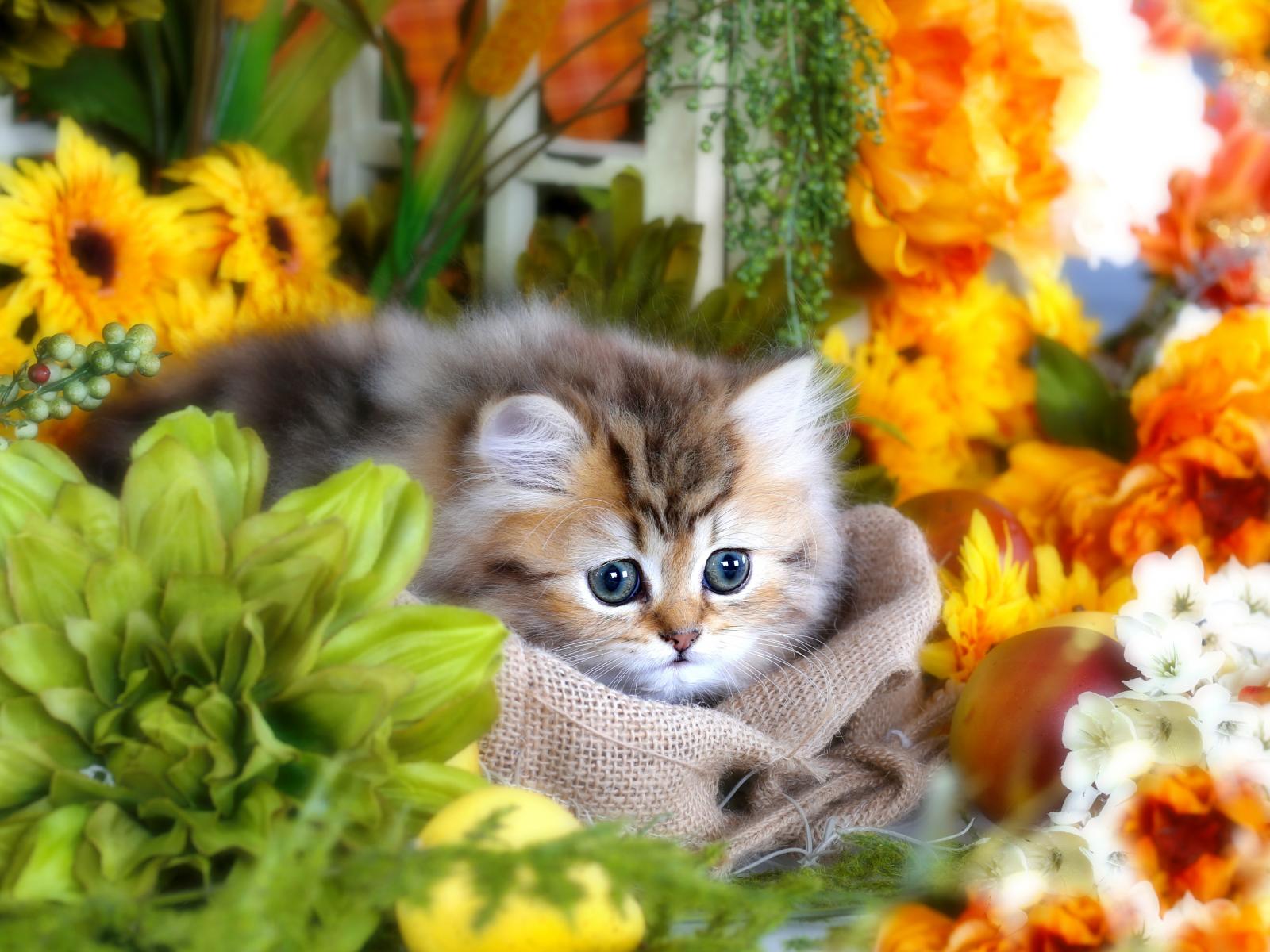 Обои Милый пушистый серый котенок с большими глазами в цветах
