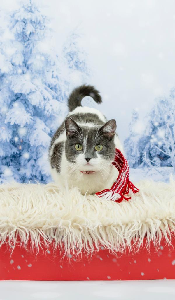Обои Кот в праздничных красных санях зимой