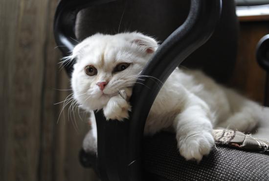 Обои Белая шотландская вислоухая кошка лежит в кресле