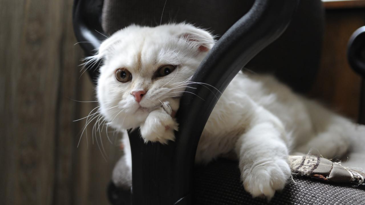 Обои Белая шотландская вислоухая кошка лежит в кресле