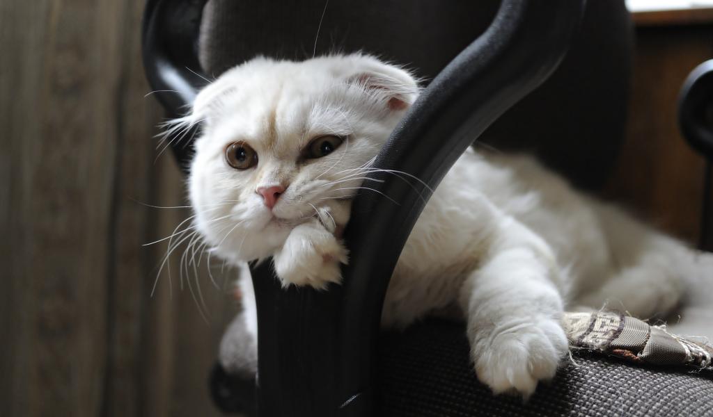 Обои Белая шотландская вислоухая кошка лежит в кресле