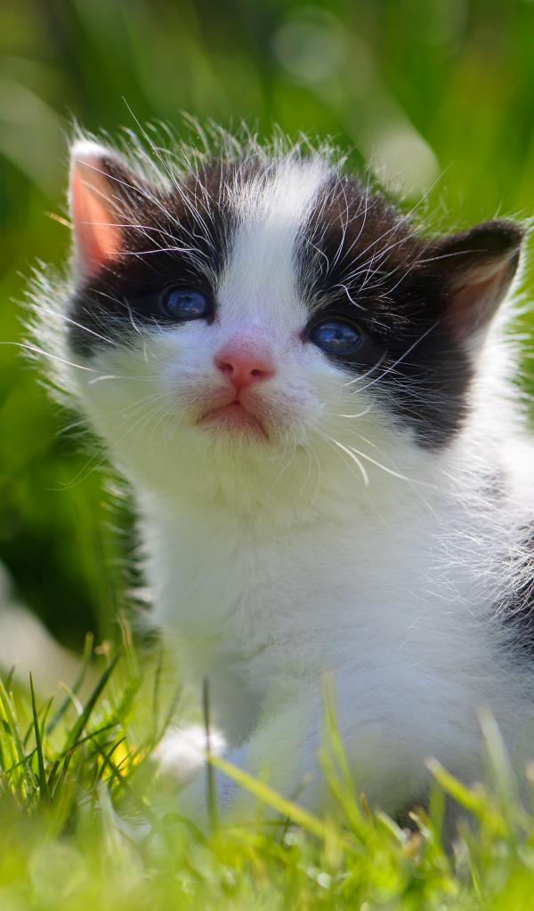 Обои Маленький черно - белый котенок сидит в зеленой траве