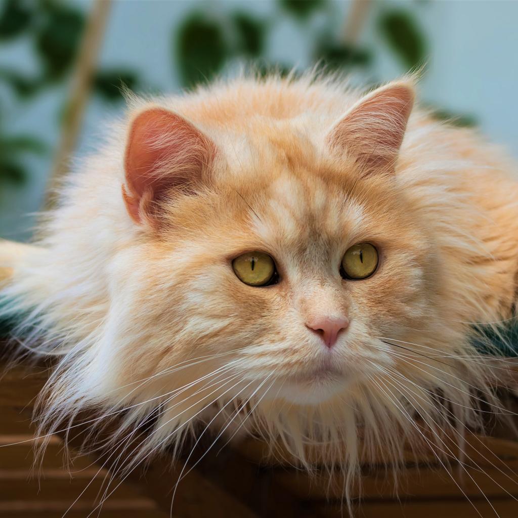 Обои Красивый рыжий пушистый кот лежит на желтой траве