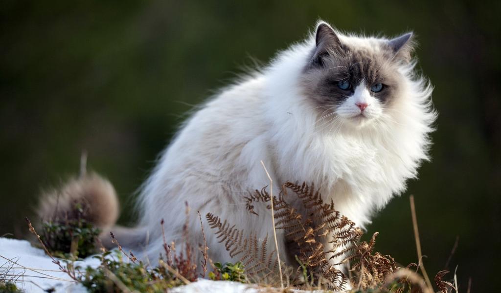 Обои Пушистый породистый кот сидит на тающем снегу весной