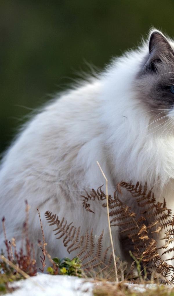 Обои Пушистый породистый кот сидит на тающем снегу весной