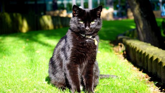 Обои Зеленоглазый черный кот сидит на зеленой траве