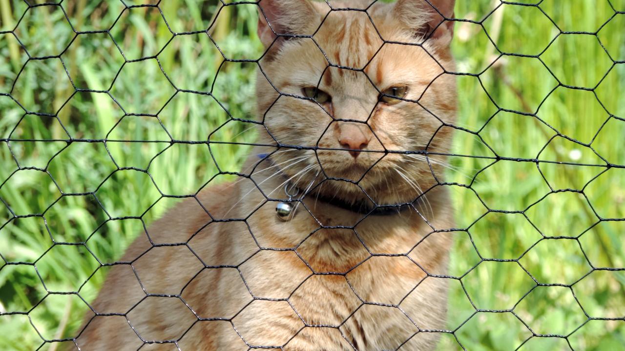 Обои Рыжий кот сидит за железной сеткой