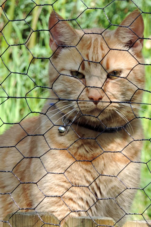 Обои Рыжий кот сидит за железной сеткой
