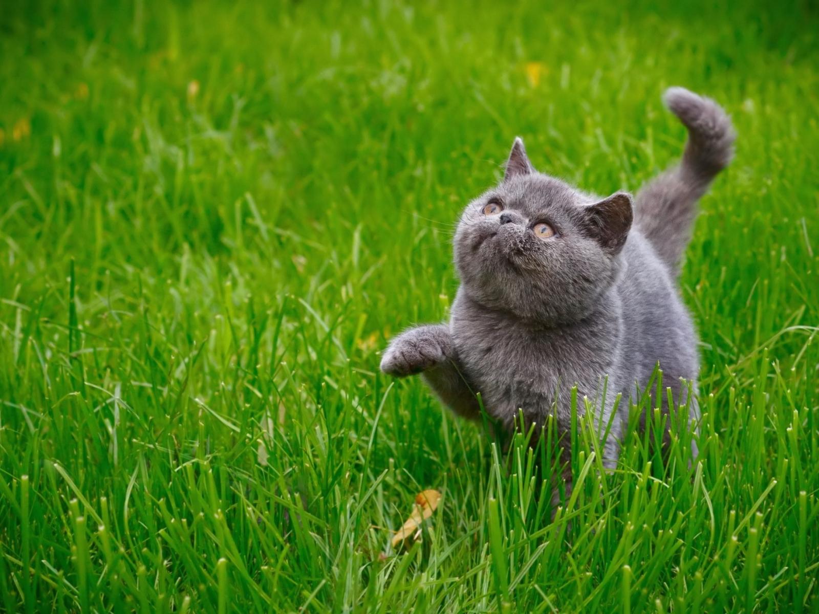 Обои Серый котенок британец гуляет по зеленой траве