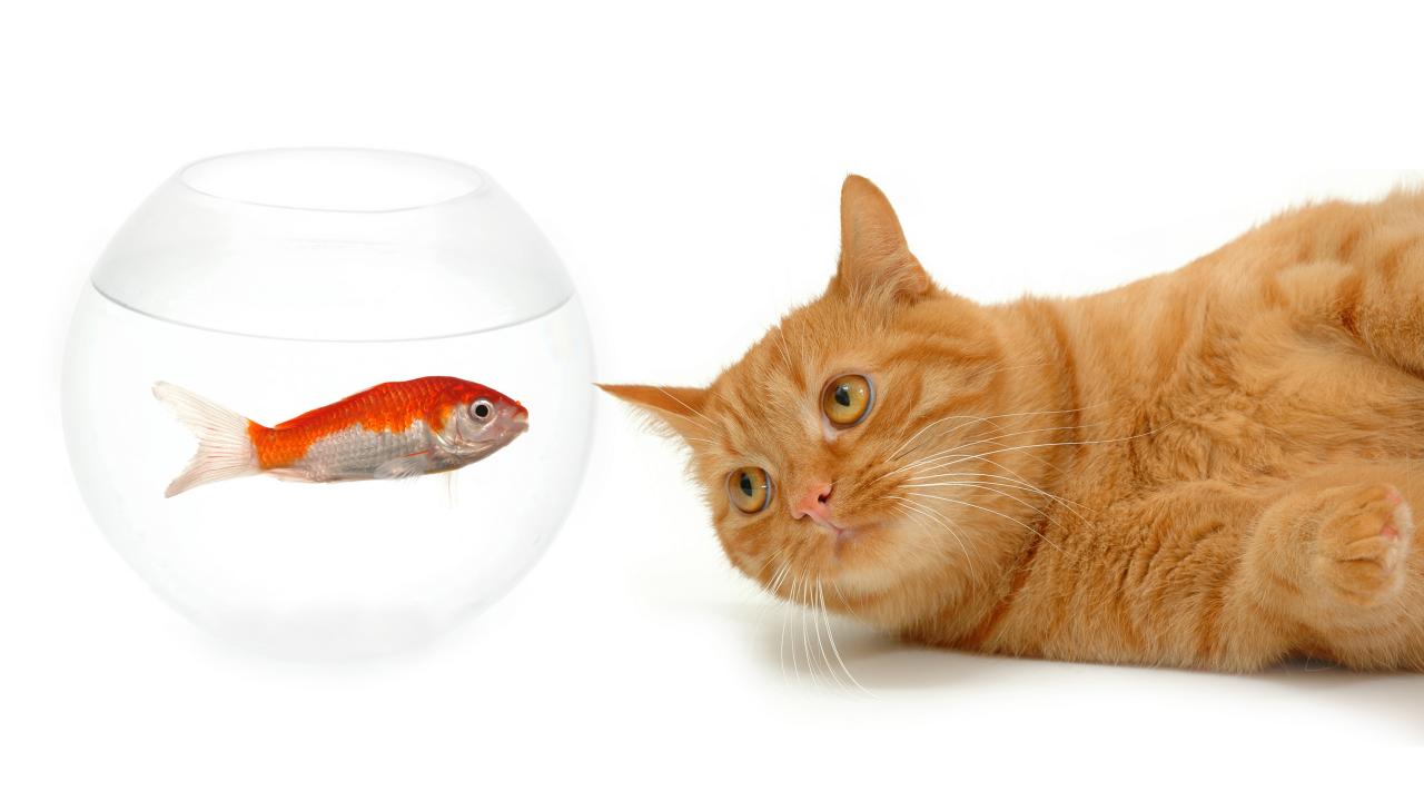 Обои Рыжий кот с золотой рыбкой на белом фоне