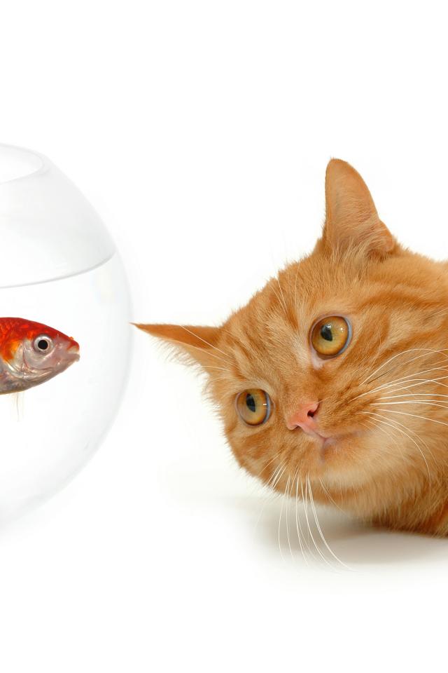 Обои Рыжий кот с золотой рыбкой на белом фоне