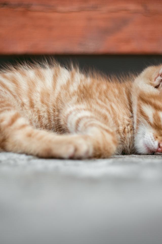 Обои Маленький рыжий котенок спит на земле