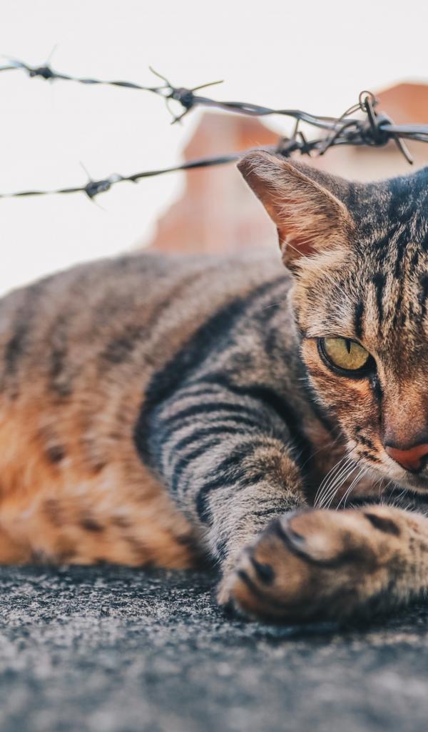 Обои Серый кот лежит под колючей проволокой