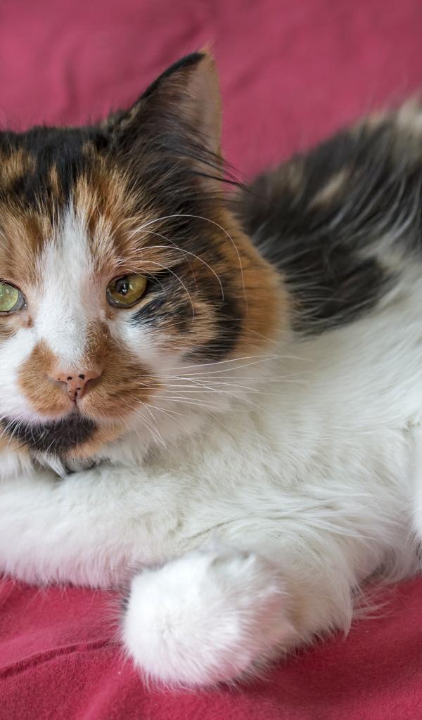 Обои Трехцветная кошка лежит на розовом покрывале