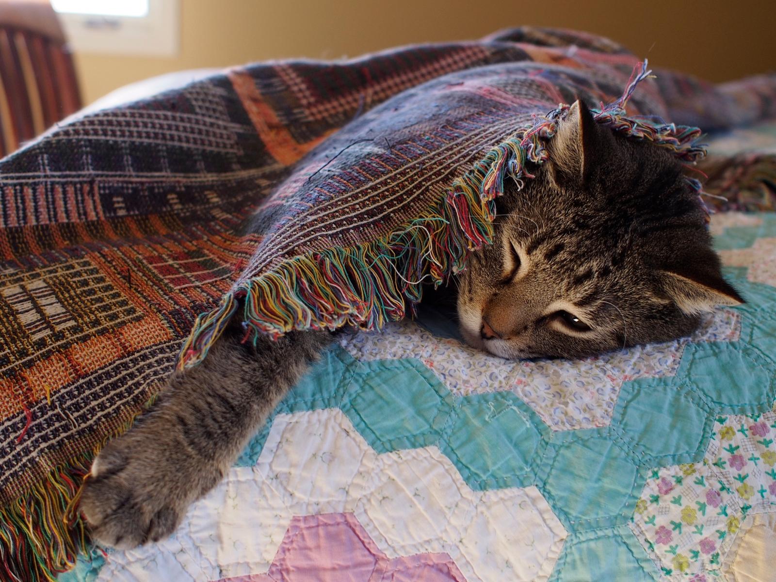 Обои Серый кот спит под покрывалом на кровати