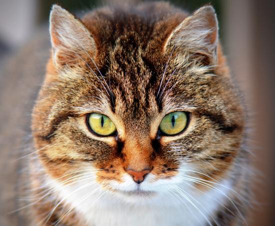 Обои Морда недовольного серого кота с зелеными глазами крупным планом