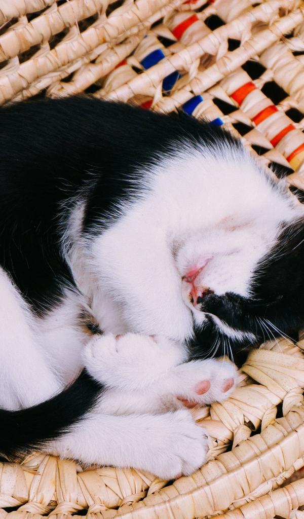 Обои Черно-белый котенок спит в корзине