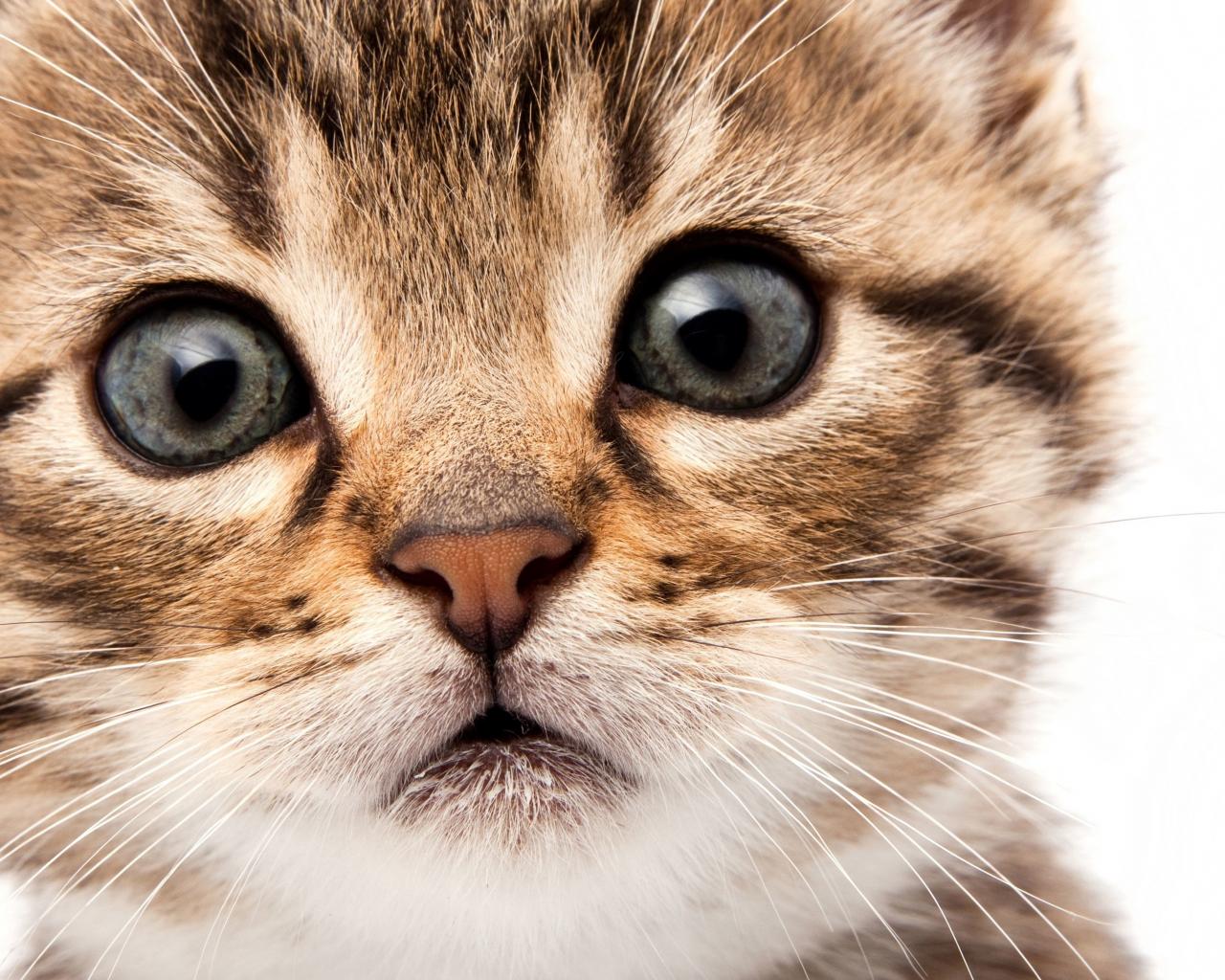 Обои Морда маленького милого котенка на белом фоне крупным планом