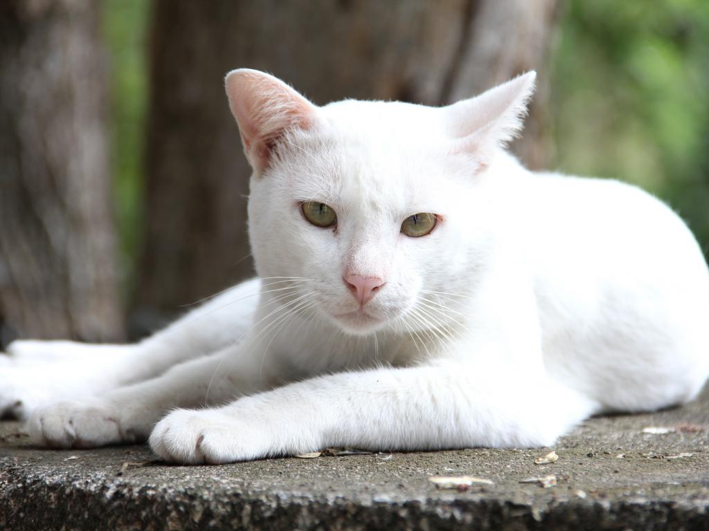 Обои Грустный белый кот лежит на земле