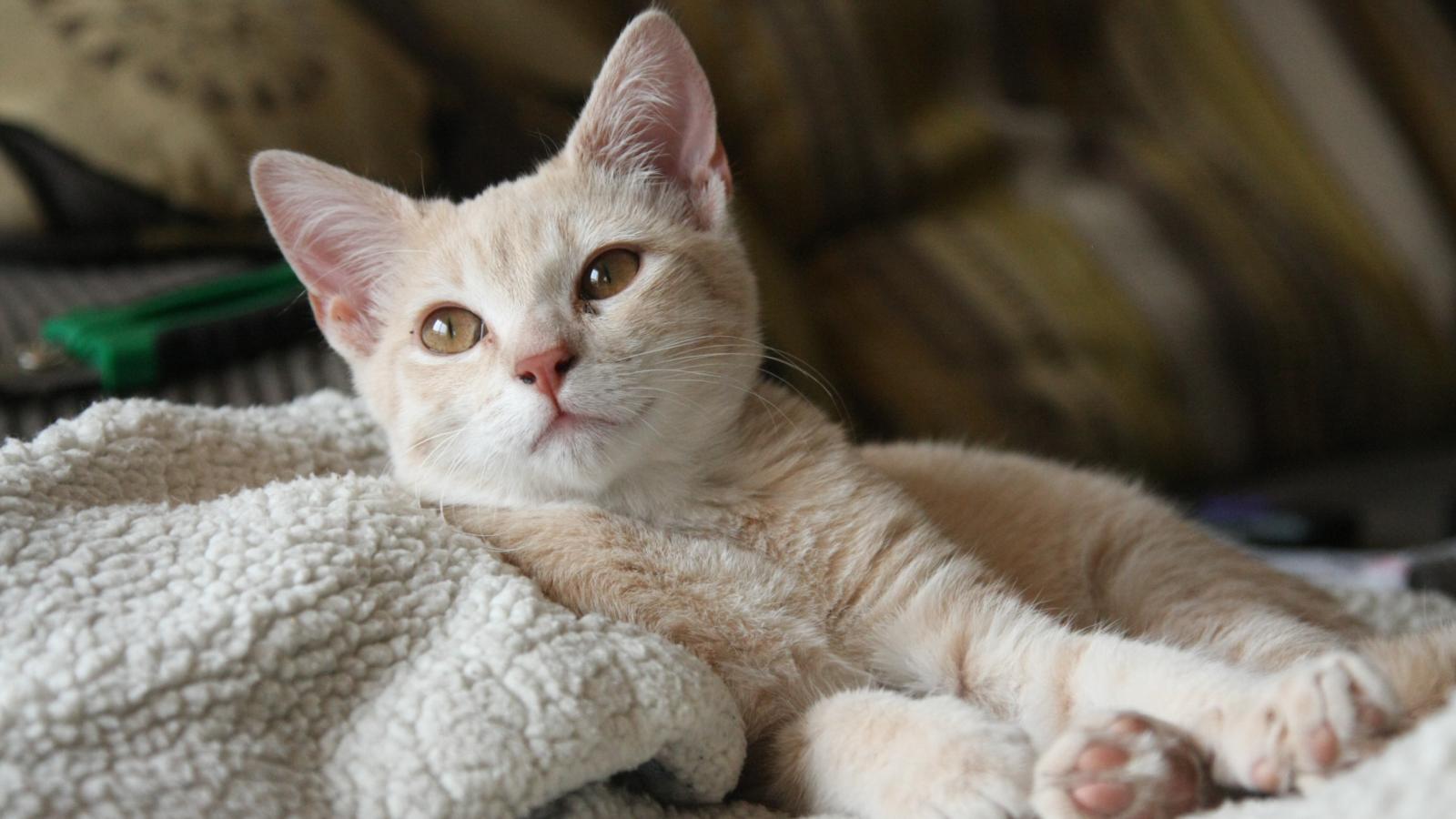 Обои Маленький рыжий котенок лежит на теплой постели