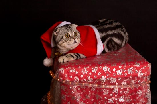 Обои Серый породистый кот в новогоднем костюме на черном фоне