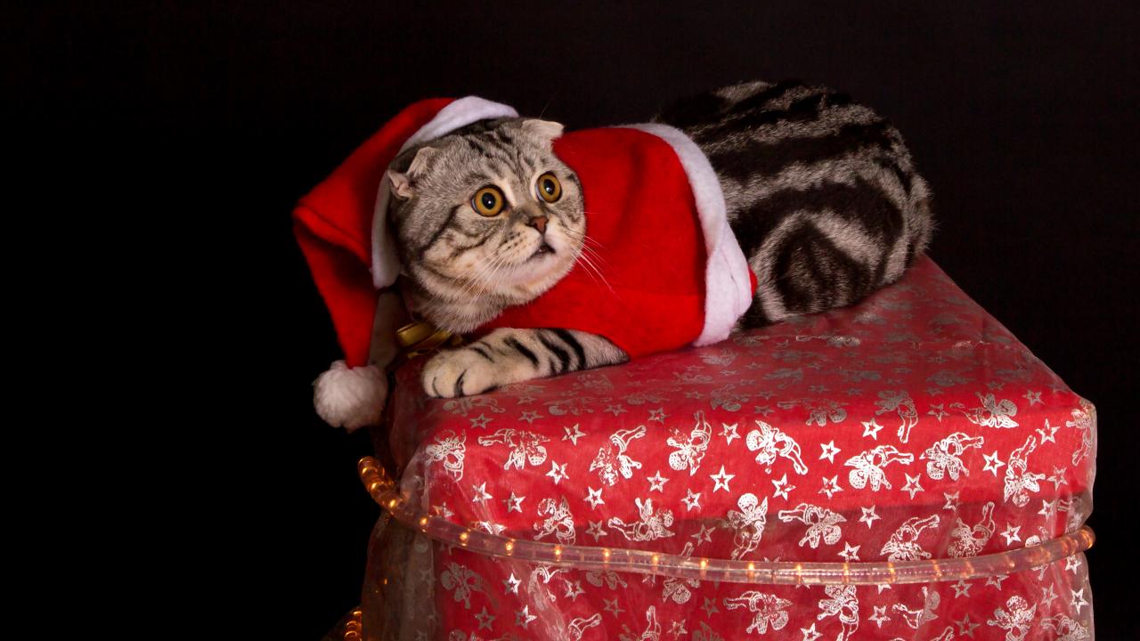 Обои Серый породистый кот в новогоднем костюме на черном фоне