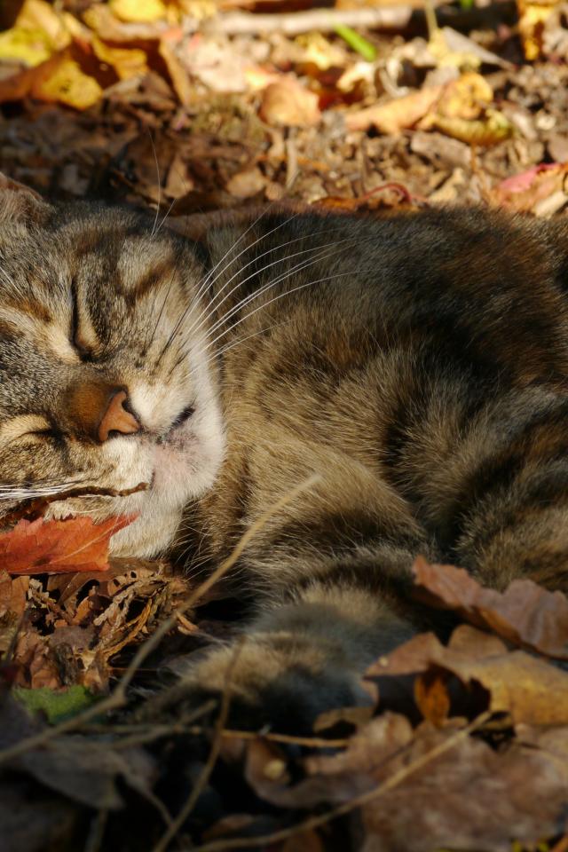 » Обои Серый красивый кот спит на желтой опавшей листве
