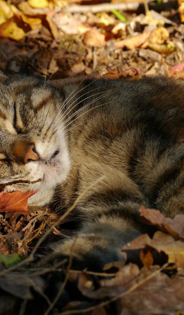Обои Серый красивый кот спит на желтой опавшей листве
