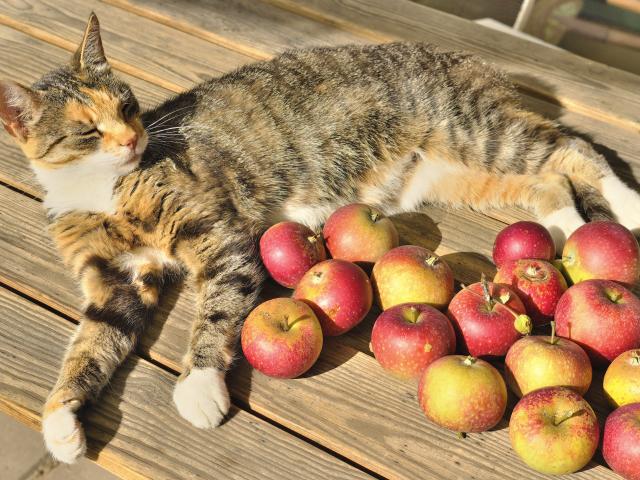 Обои Серый кот лежит на столе с красными яблоками