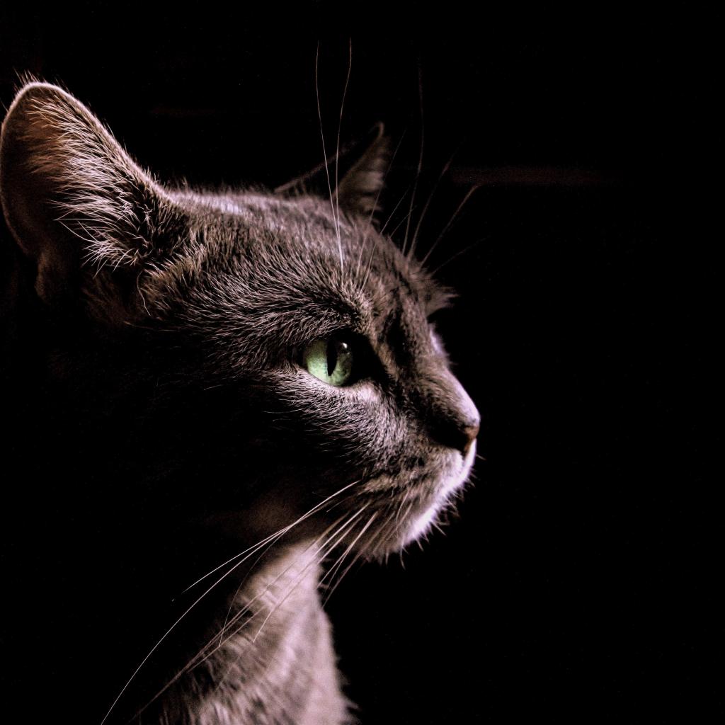 » Обои Серый кот на черном фоне, вид сбоку