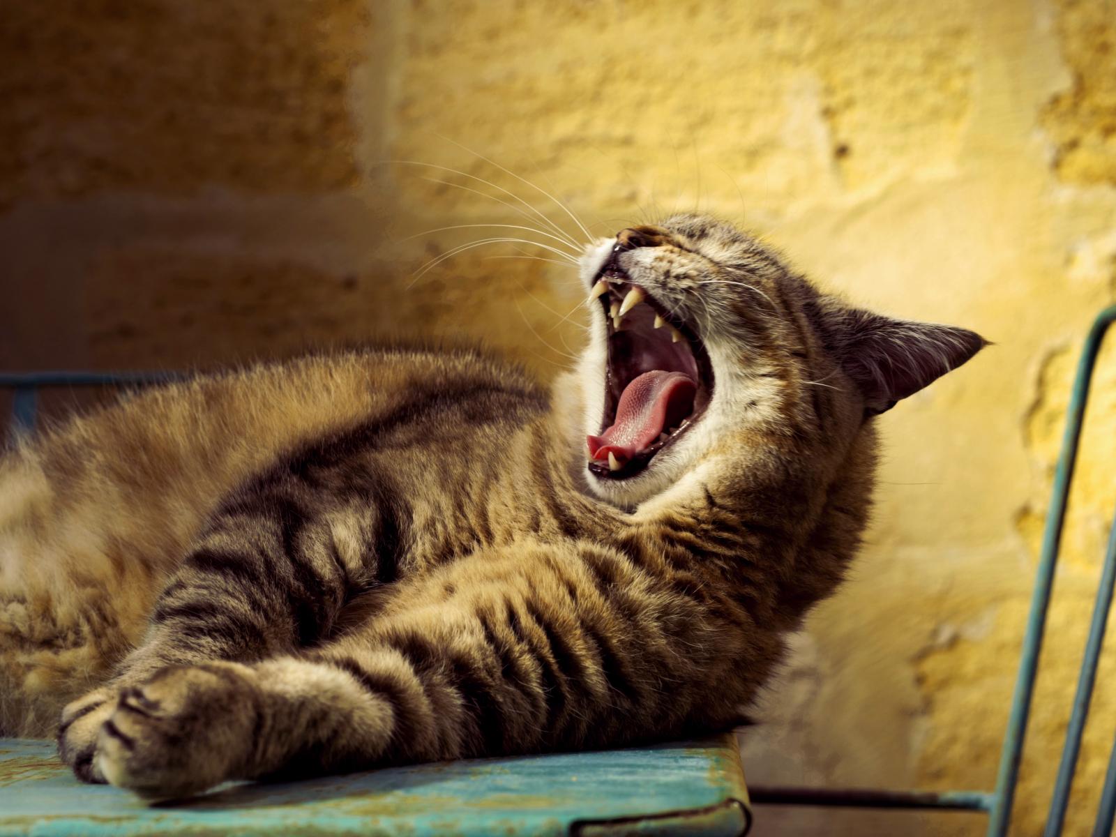 Обои Большой серый кот зевает