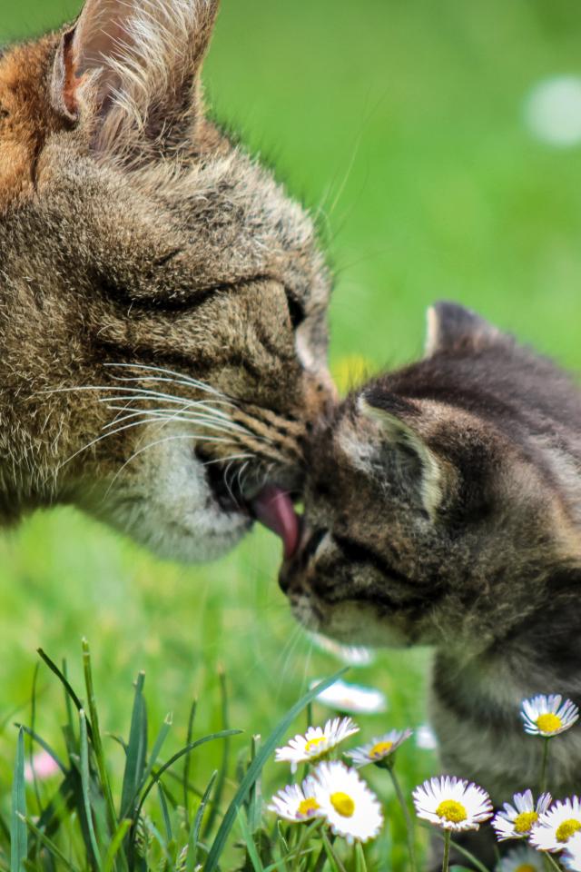 Обои Мама кошка умывает серого котенка на зеленой траве