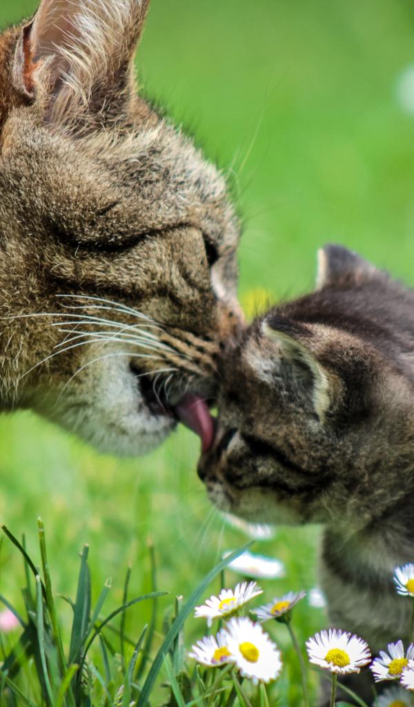 Обои Мама кошка умывает серого котенка на зеленой траве