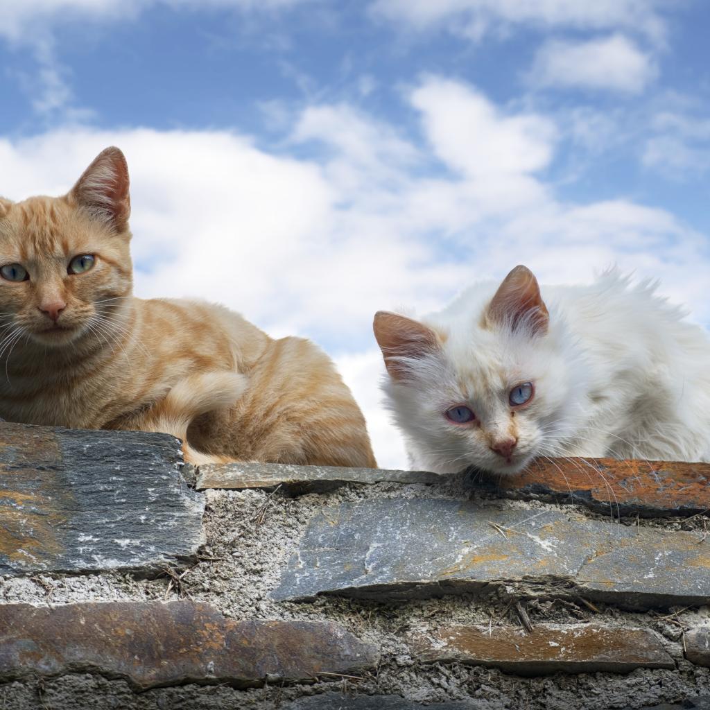 Обои Белый и серый кот сидят на каменной стене на фоне голубого неба